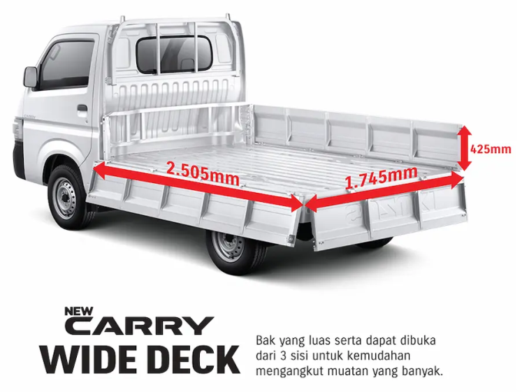 New Carry Pick Up kini dilengkapi dengan bak yang lebih luas dan sasis yang lebih kuat membuat kapasitas angkut hingga 1 ton. New Carry Pick Up hadir dalam varian wide deck dan flat deck yang lebih ekonomis dan dapat disesuaikan dengan bisnis Anda.