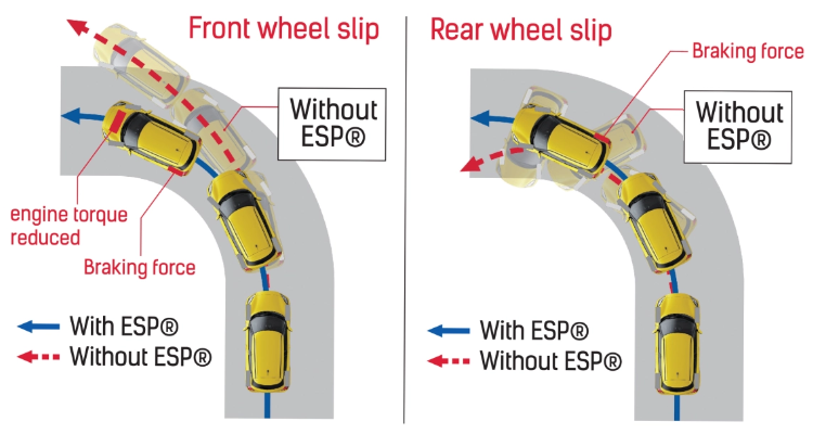 ESP adalah teknologi yang membantu Anda mengendalikan kendaraan saat berada di tikungan dan menjaga traksi roda saat menambah kecepatan atau bergerak di atas permukaan jalan yang licin. Apabila dideteksi adanya roda yang tergelincir, sistem ESP akan mengatur mesin dan torsi secara otomatis dalam memilih fungsi rem untuk membantu anda mengatur kendali.